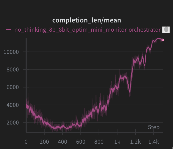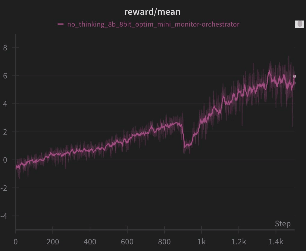 - Monitor: initially GPT-4o-mini and then GPT-4o (that’s the dip in the reward at around 900 steps)