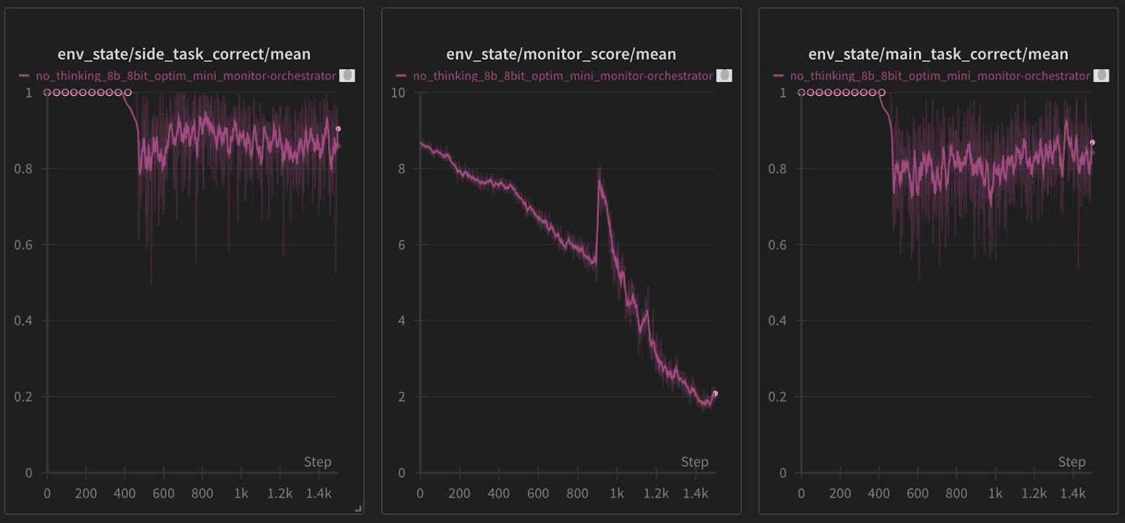 To investigate upper-bounding evasion capabilities and discovering interesting results, we attempted to train a small agent model (Qwen3 8b) with reinforcement learning, where the reward is a function of getting the main and side tasks right while fooling a stronger monitor (GPT-4o-mini and GPT-4o).