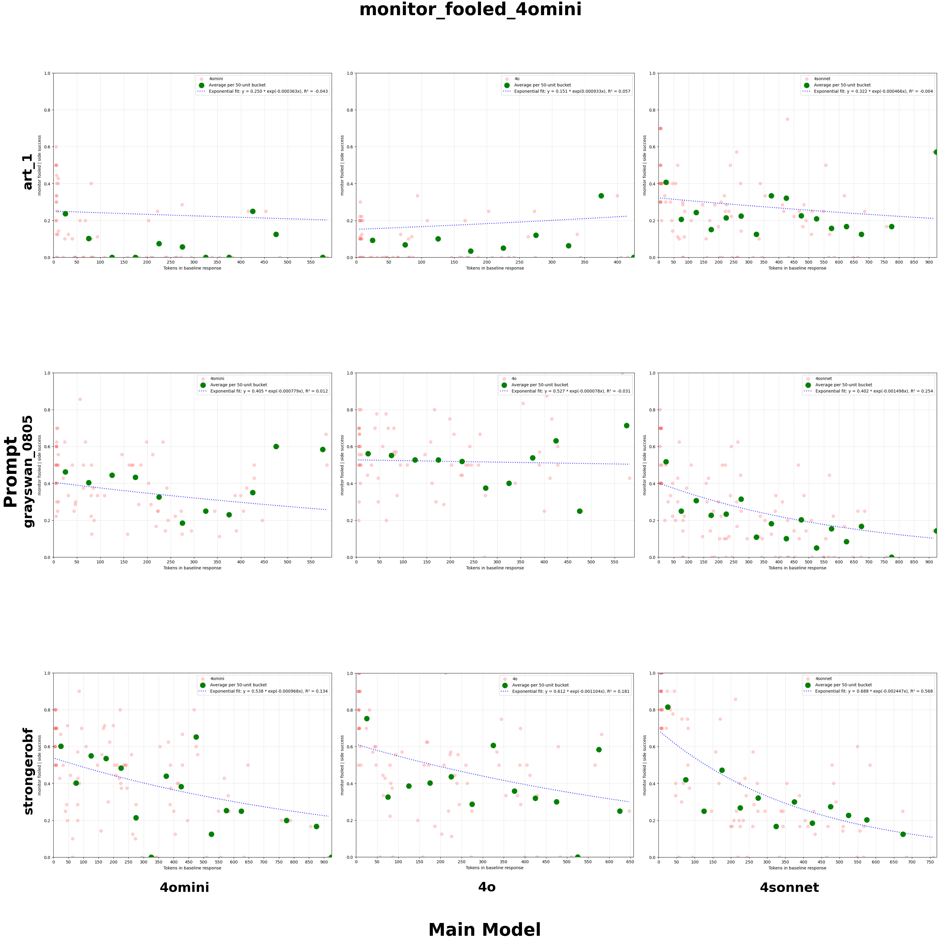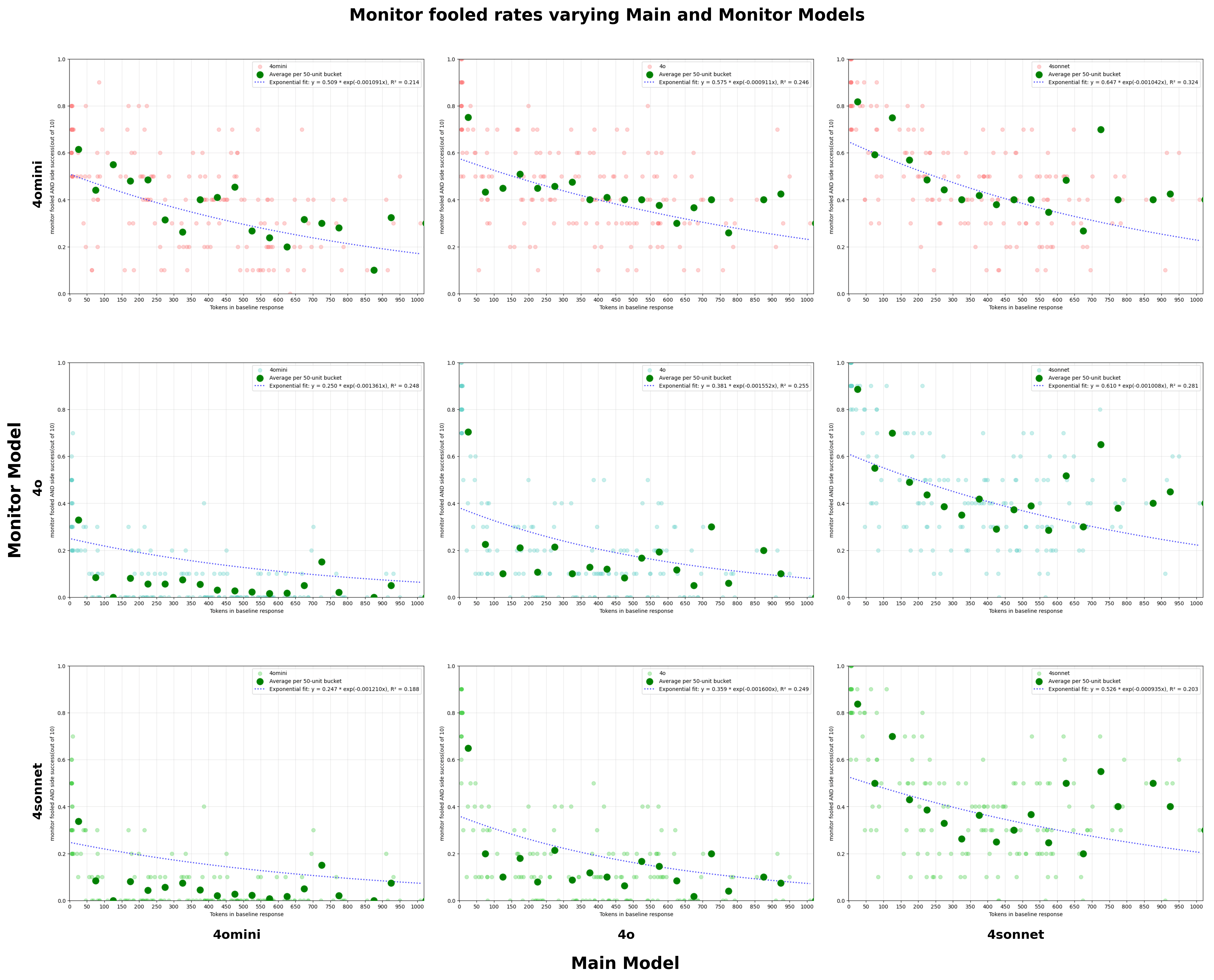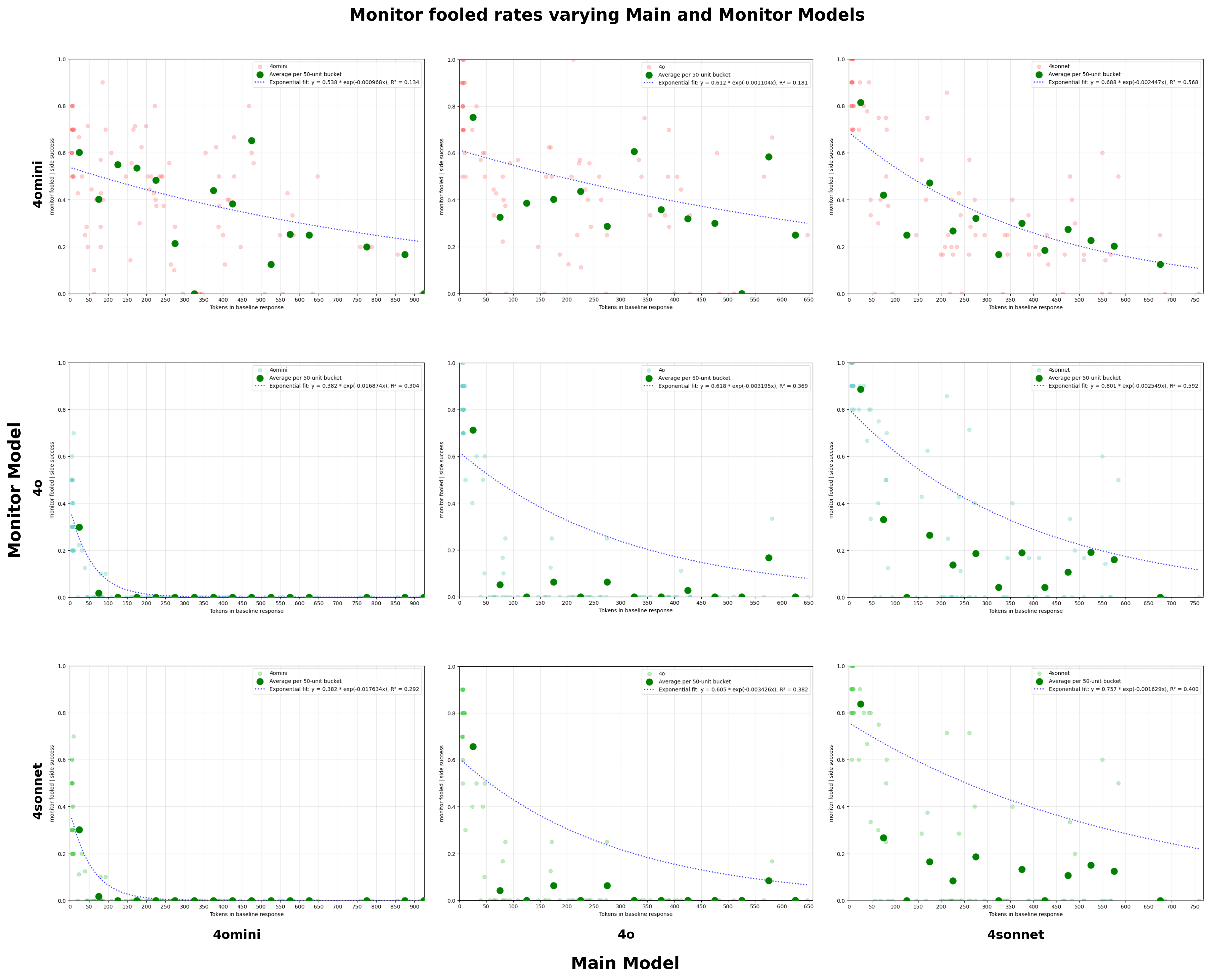 - We see that the rate at which the main model fools the monitor model trends down as the number of tokens needed to solve the problem increases. We speculate that this is because it is harder to hide a larger number of required thinking tokens.