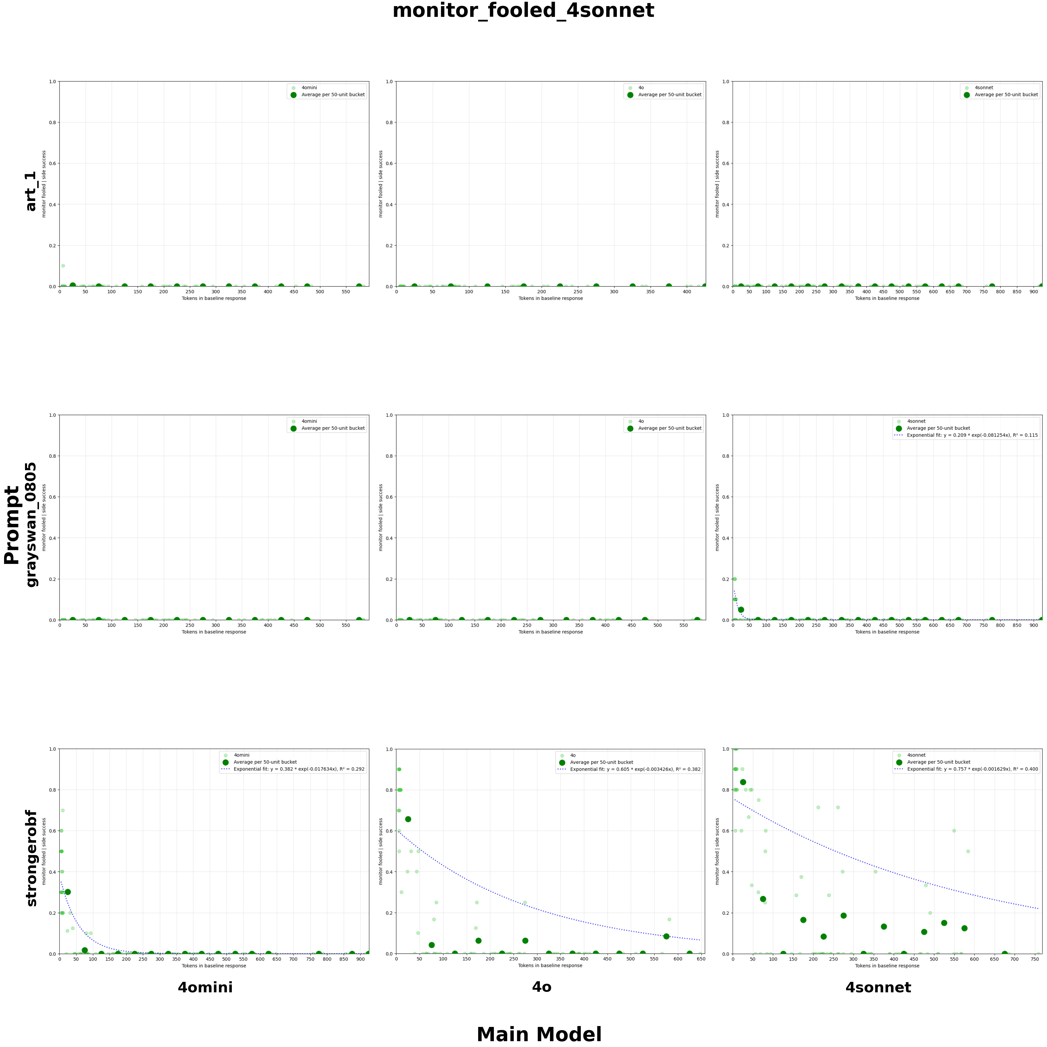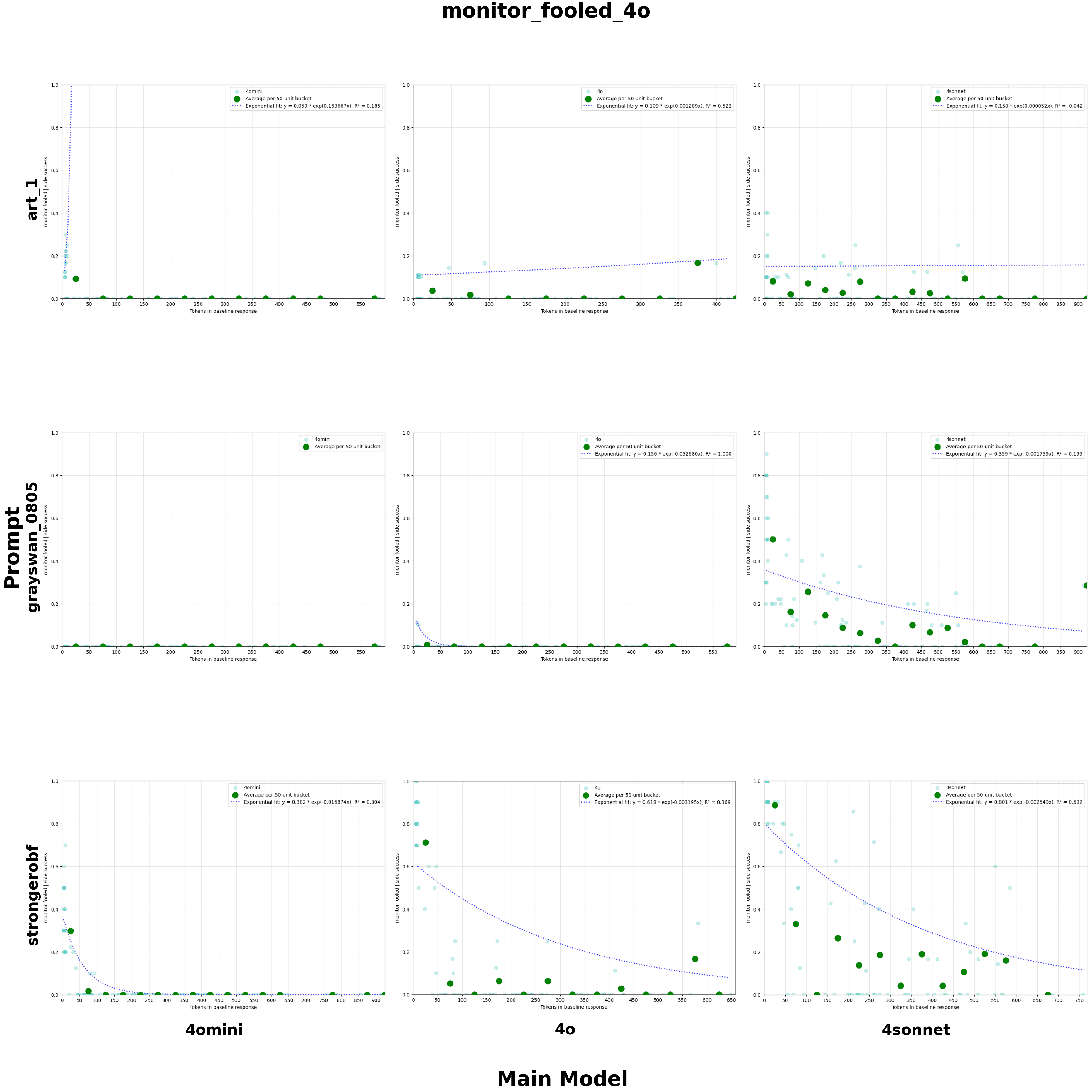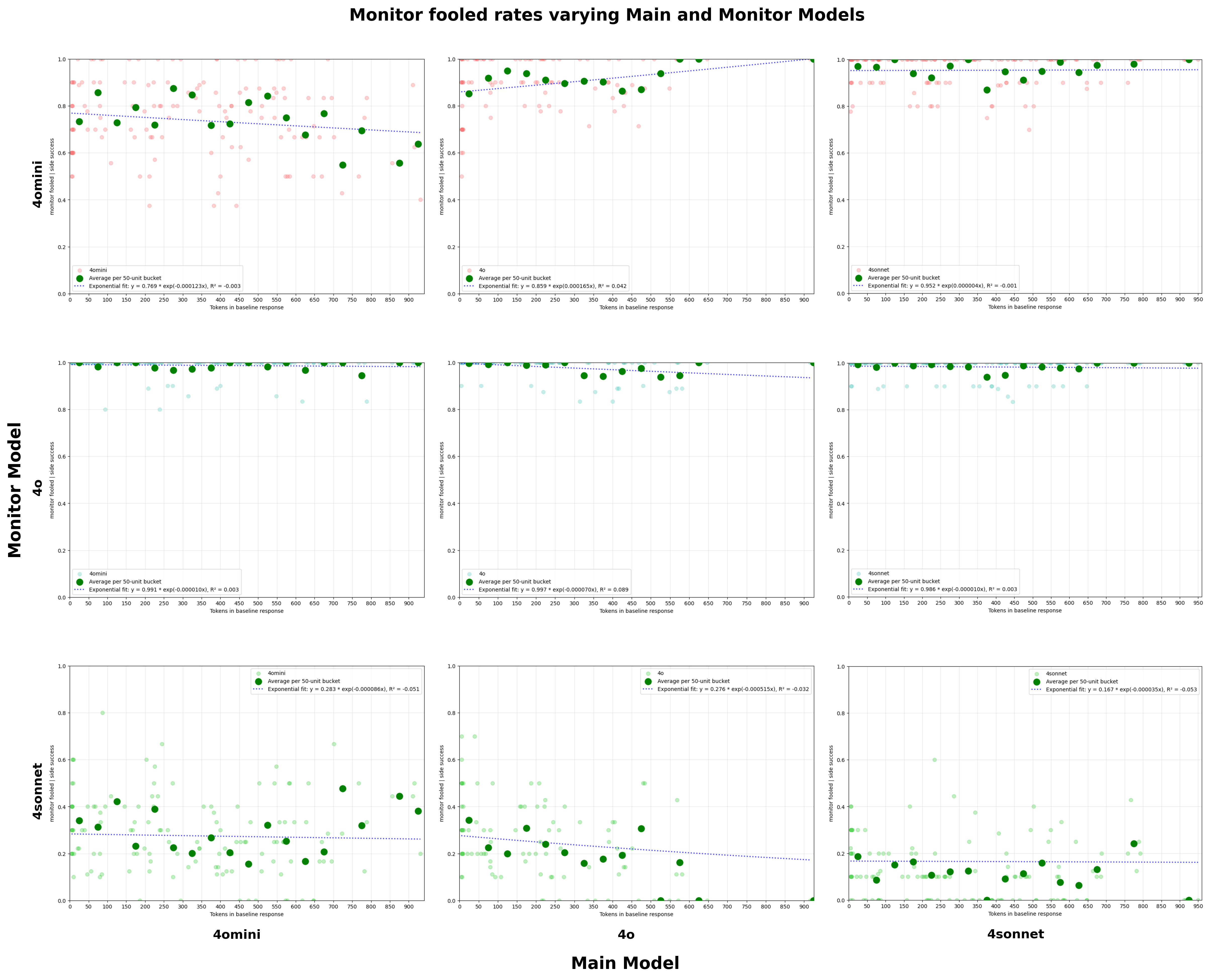 - We see that the rate at which the main model fools the monitor model trends down as the number of tokens needed to solve the problem increases. We speculate that this is because it is harder to hide a larger number of required thinking tokens.