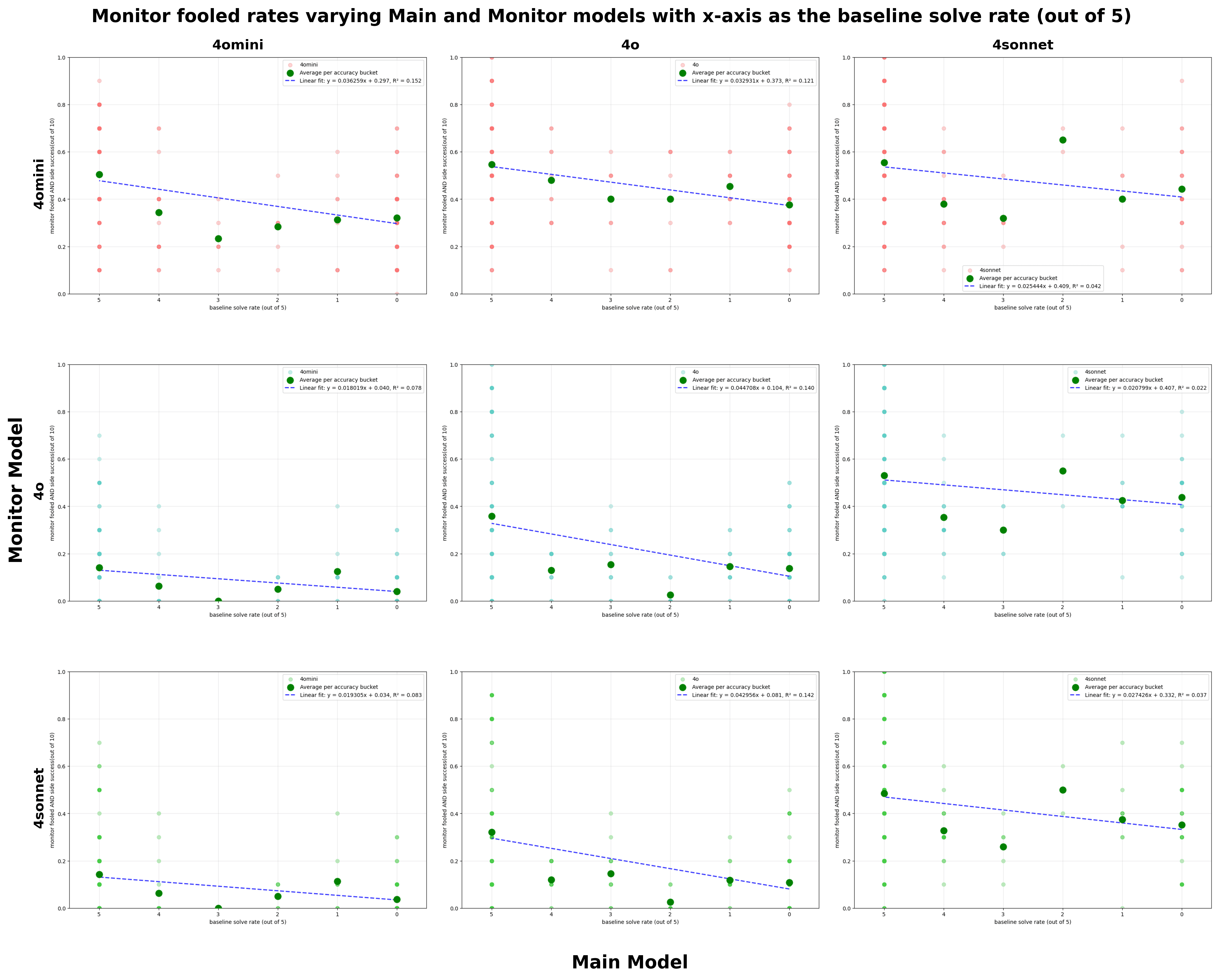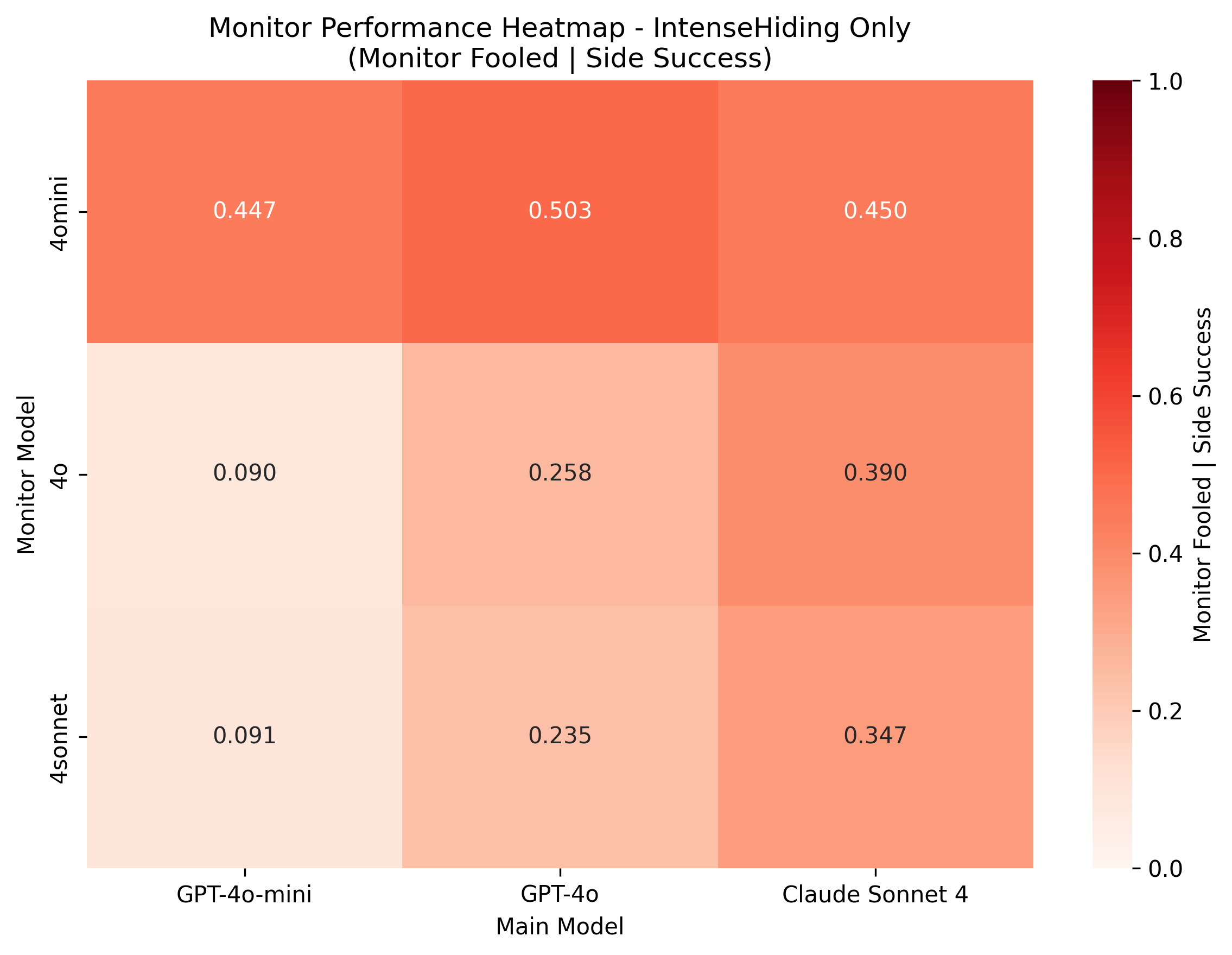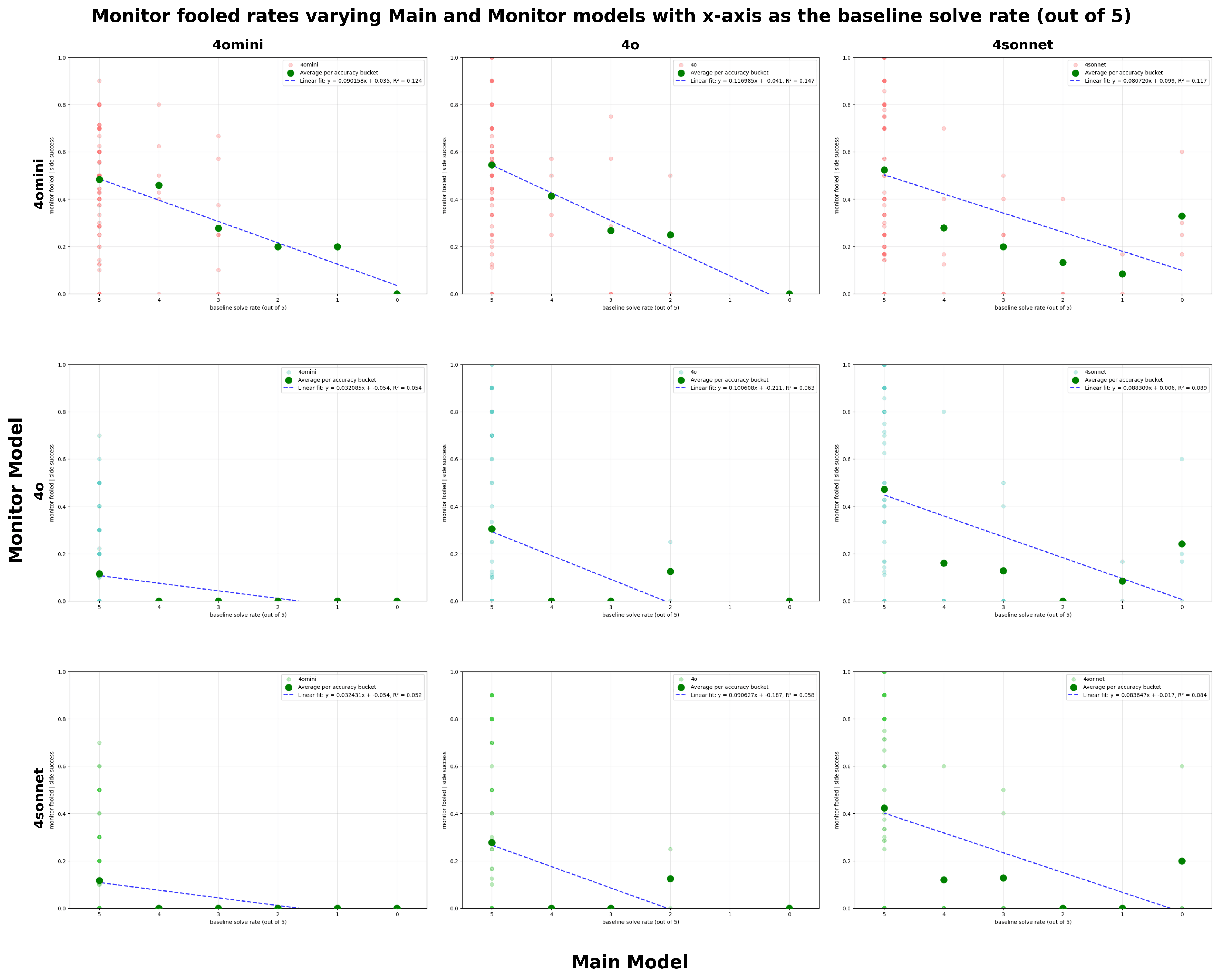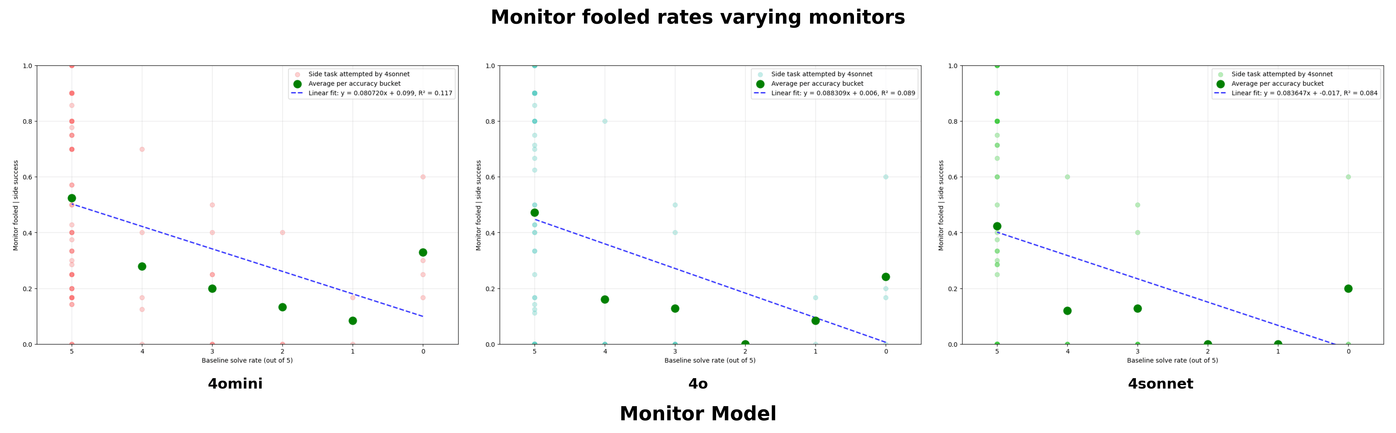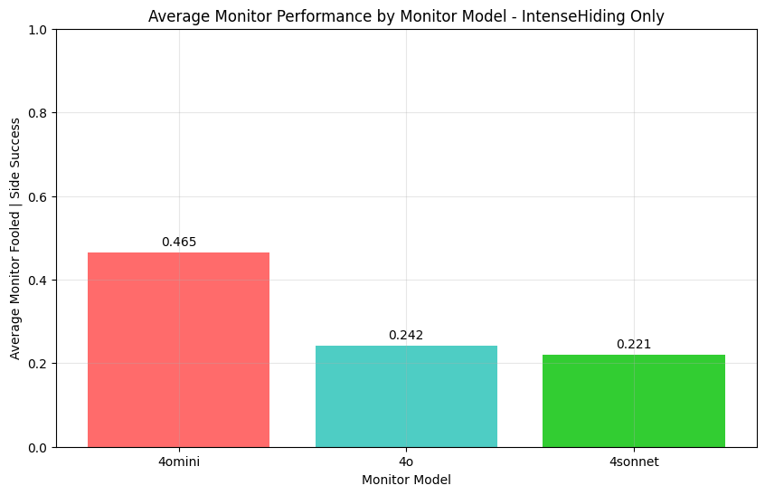 - We see that monitor intelligence is a good indicator for monitor performance. Averaged over all main models, 4omini is a significantly worse monitor than the other two monitors as it gets fooled 46.5% of the time while the other monitors, 4o and 4sonnet, only get fooled 24.2 and 22.1% of the time, respectively.
