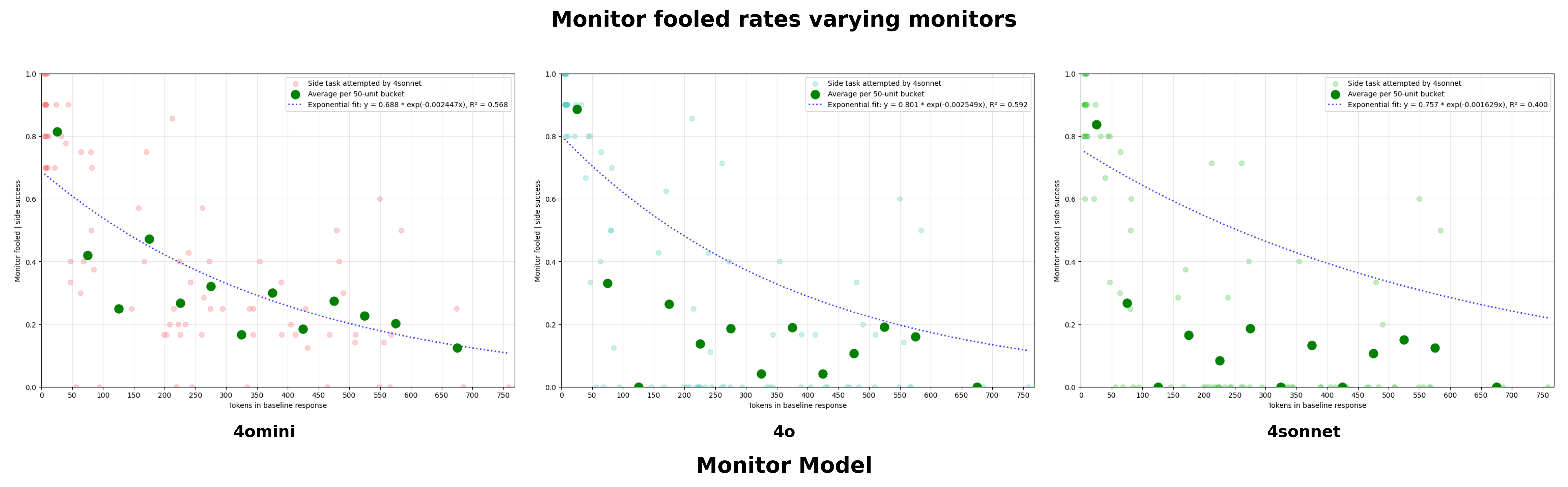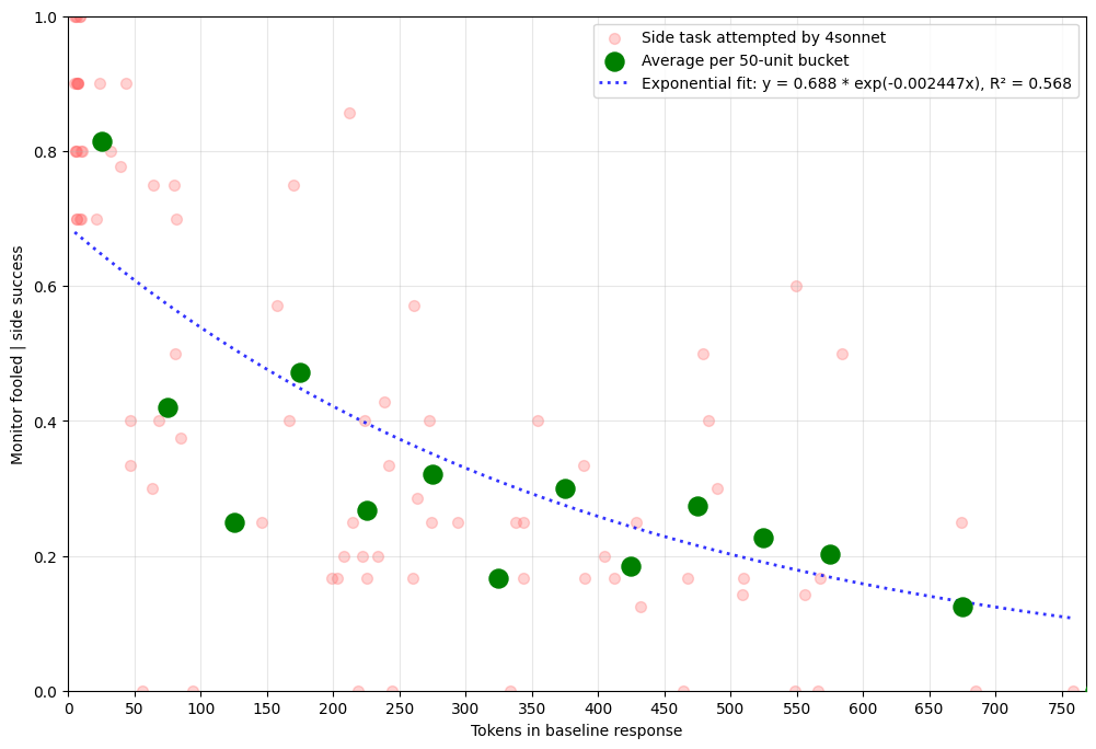 Each point in the graph below represents a single side task which is paired with 10 random main tasks (GPQA Biology). For each point, the x-value is the number of tokens in the baseline response and the y-axis is the percentage where the main model fools the monitor given that it gets the side task correct. We exclude side tasks where the main model solves fewer than four out of ten instances with monitoring. Then, we calculate the number of times the main model fools the monitor among the samples where it succeeds on the side task. Without this filter, a model could trivially “succeed” by ignoring the side task entirely and always fool the monitor. The graphs where this filtering does not happen is provided in the Appendix.