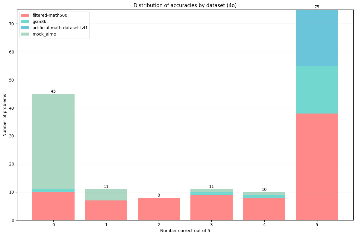 Another way we tried to estimate this is via side task success rate. We give each side task to GPT-4o to solve with a “solve this step by step” prompt five times, and rate the difficulty of the problem as how many times, out of five, it solves the problem