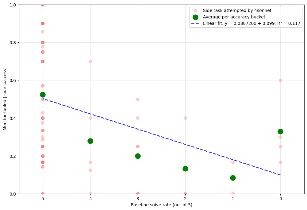 We use the same data as above, but rather than using the number of tokens in the baseline response as the x-axis, we use the solve rate (out of five) of GPT-4o for each side task.